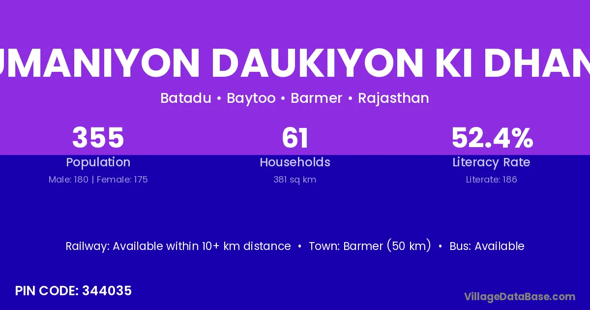 Umaniyon Daukiyon Ki Dhani village has a total population of 355 people, of which 180 are males and 175 are females.