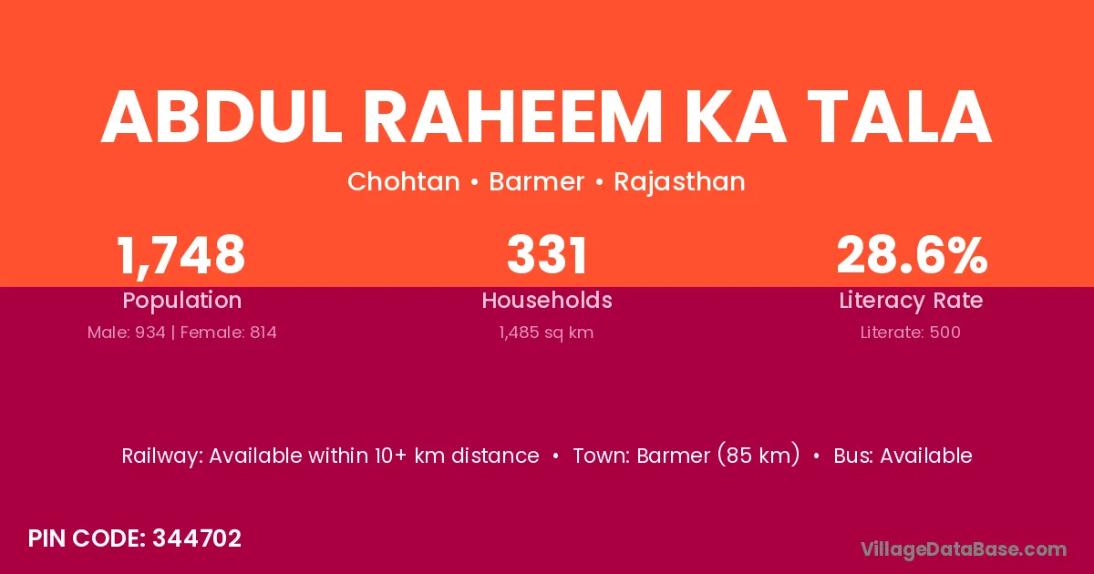 Barmer (85 km) is the nearest town to Abdul Raheem Ka Tala village for major economic activities and is located approximately 85 km away.