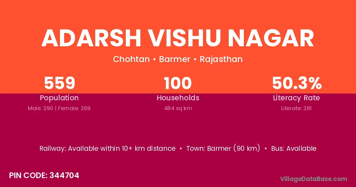 Barmer (90 km) is the nearest town to Adarsh Vishu Nagar village for major economic activities and is located approximately 90 km away.