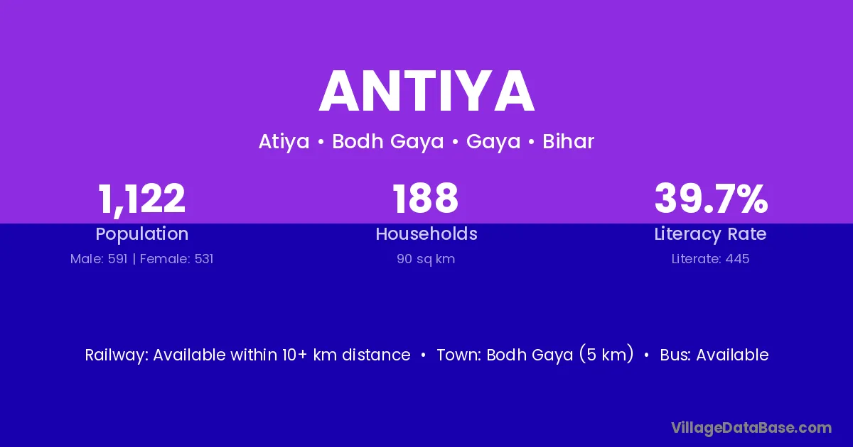The literacy rate of Antiya village is 48.04%. Male literacy stands at 58.67% and female literacy at 36.78%.
