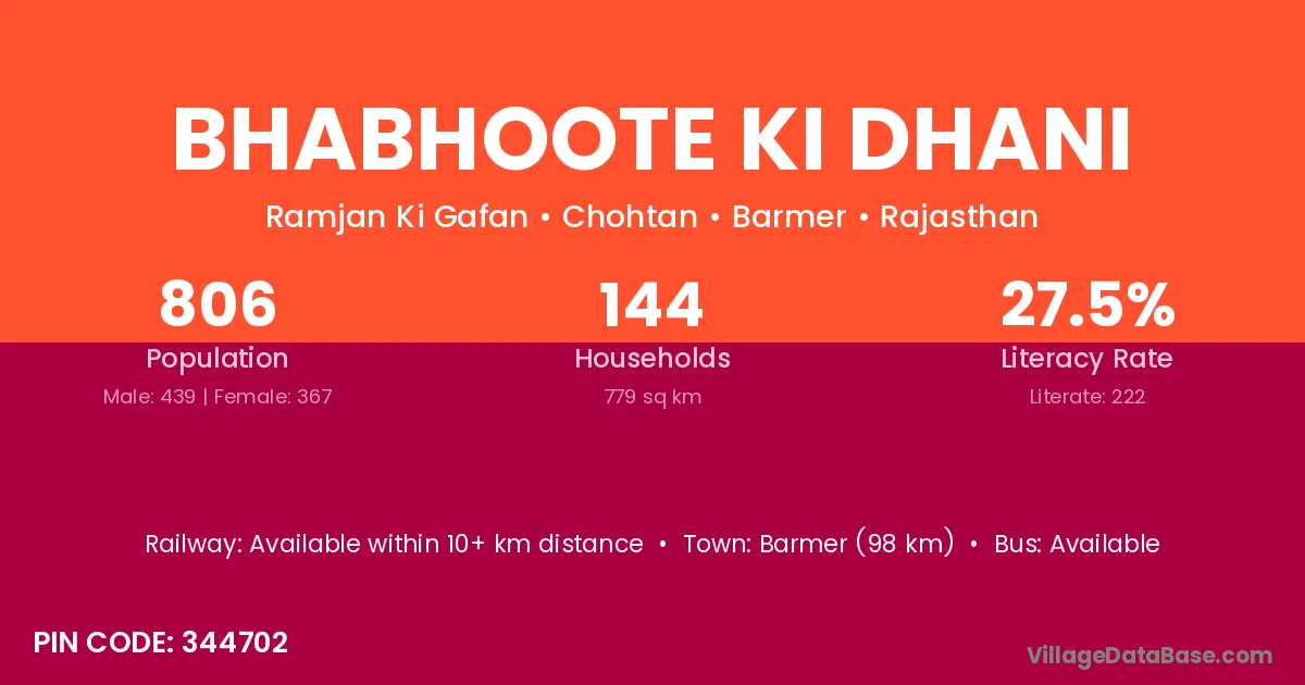 Bhabhoote Ki Dhani village has a total population of 806 people, of which 439 are males and 367 are females.