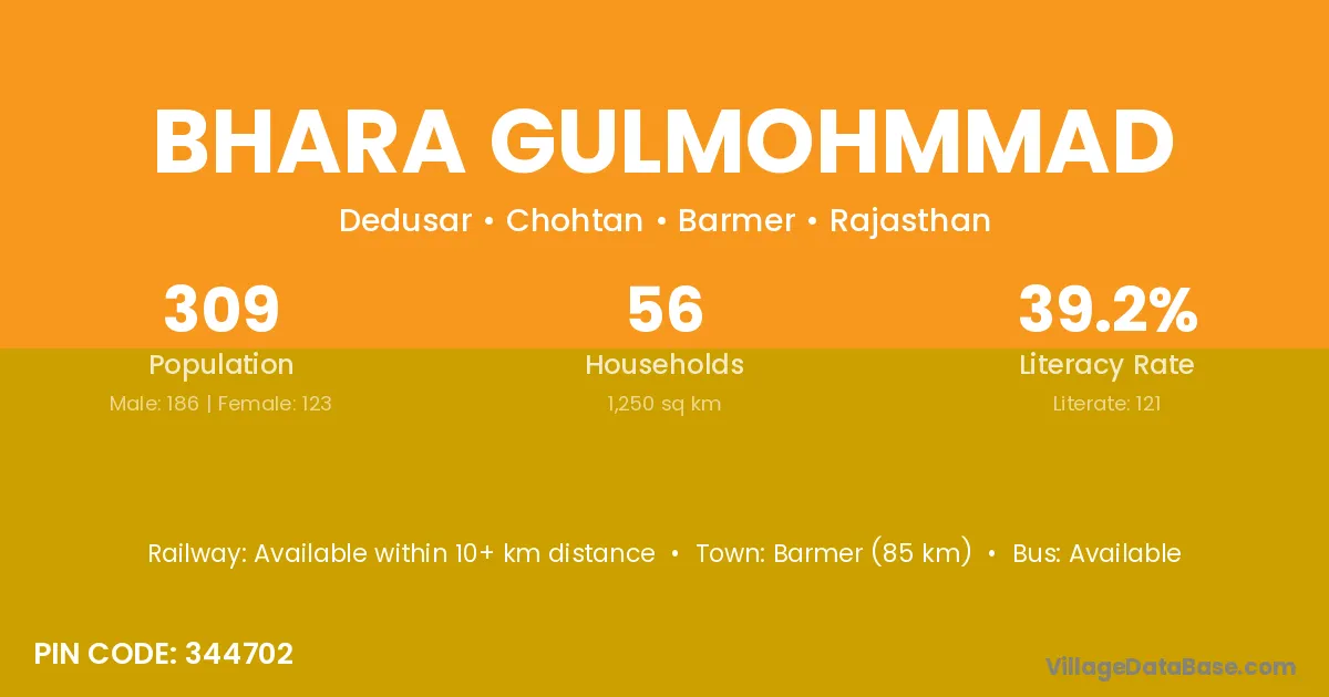 Barmer (85 km) is the nearest town to Bhara Gulmohmmad village for major economic activities and is located approximately 85 km away.