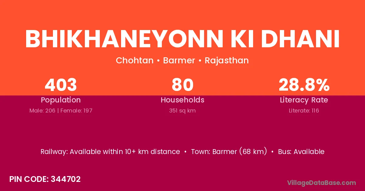 Bhikhaneyonn Ki Dhani village has a total population of 403 people, of which 206 are males and 197 are females.