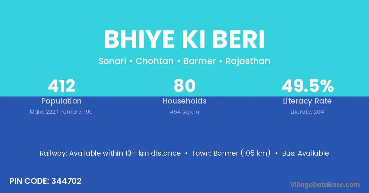 Barmer (105 km) is the nearest town to Bhiye Ki Beri village for major economic activities and is located approximately 105 km away.