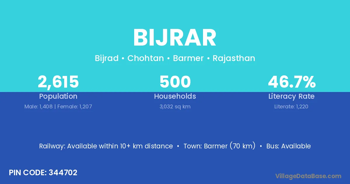 Barmer (70 km) is the nearest town to Bijrar village for major economic activities and is located approximately 70 km away.