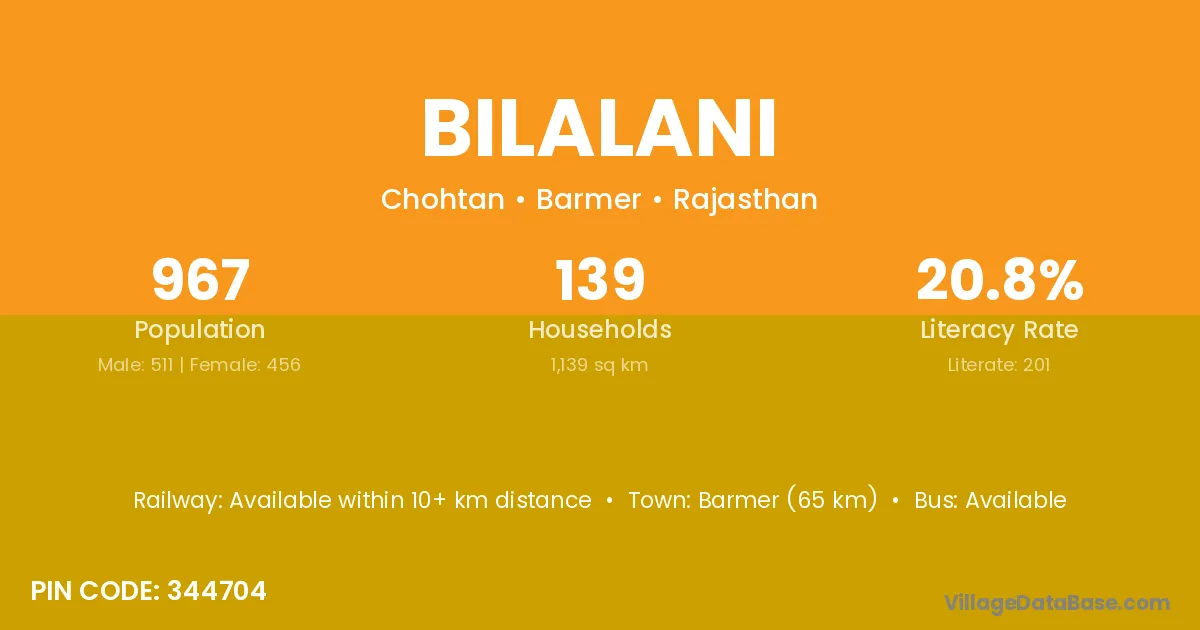 Barmer (65 km) is the nearest town to Bilalani village for major economic activities and is located approximately 65 km away.