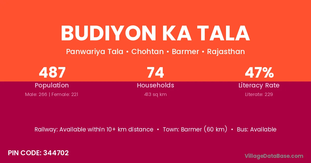 Barmer (60 km) is the nearest town to Budiyon Ka Tala village for major economic activities and is located approximately 60 km away.