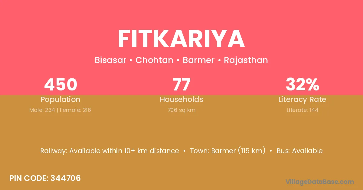 Barmer (115 km) is the nearest town to Fitkariya village for major economic activities and is located approximately 115 km away.