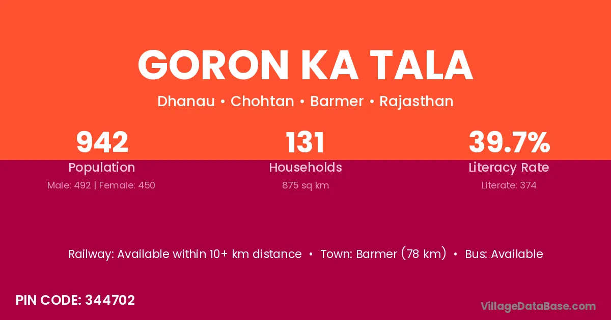 Barmer (78 km) is the nearest town to Goron Ka Tala village for major economic activities and is located approximately 78 km away.