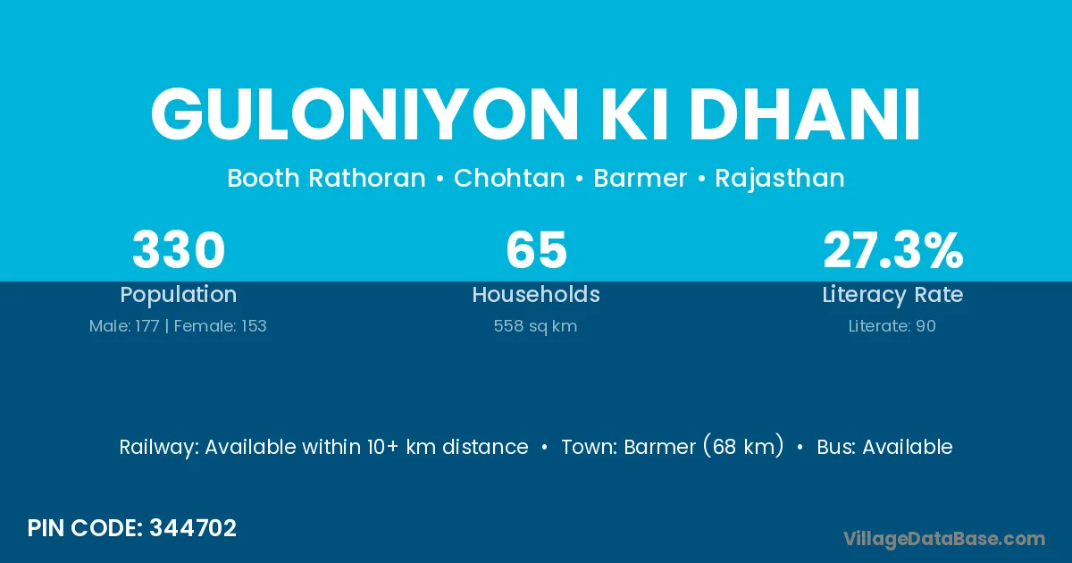 Barmer (68 km) is the nearest town to Guloniyon Ki Dhani village for major economic activities and is located approximately 68 km away.