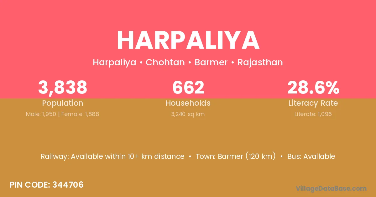Barmer (120 km) is the nearest town to Harpaliya village for major economic activities and is located approximately 120 km away.