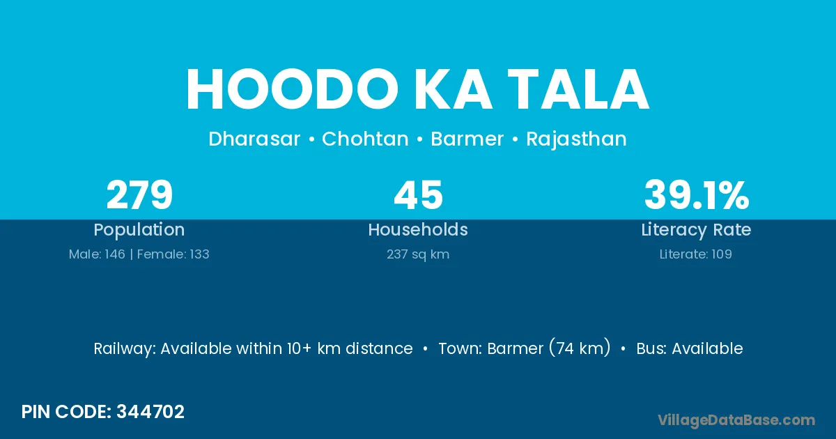 Barmer (74 km) is the nearest town to Hoodo Ka Tala village for major economic activities and is located approximately 74 km away.