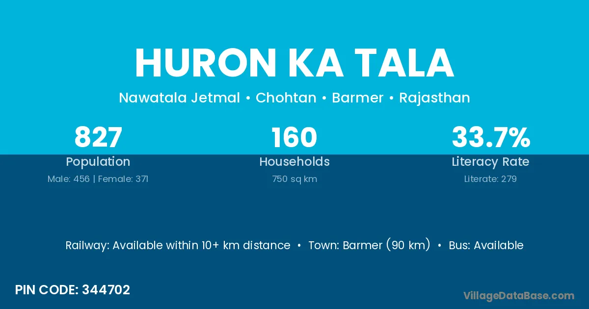 Barmer (90 km) is the nearest town to Huron Ka Tala village for major economic activities and is located approximately 90 km away.