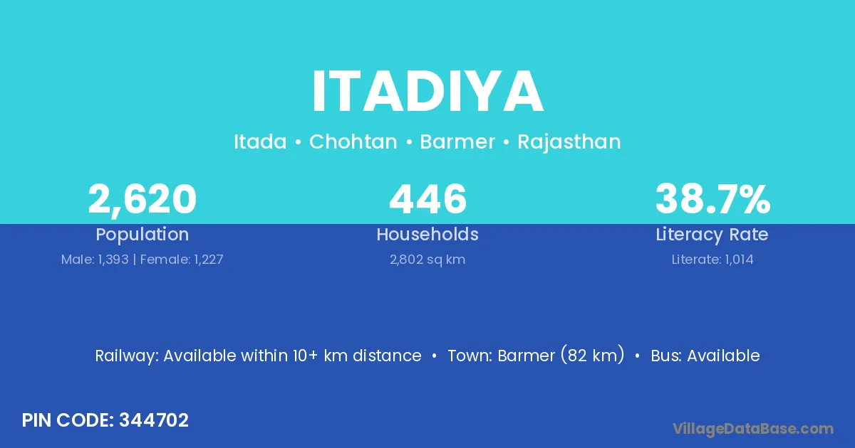Barmer (82 km) is the nearest town to Itadiya village for major economic activities and is located approximately 82 km away.