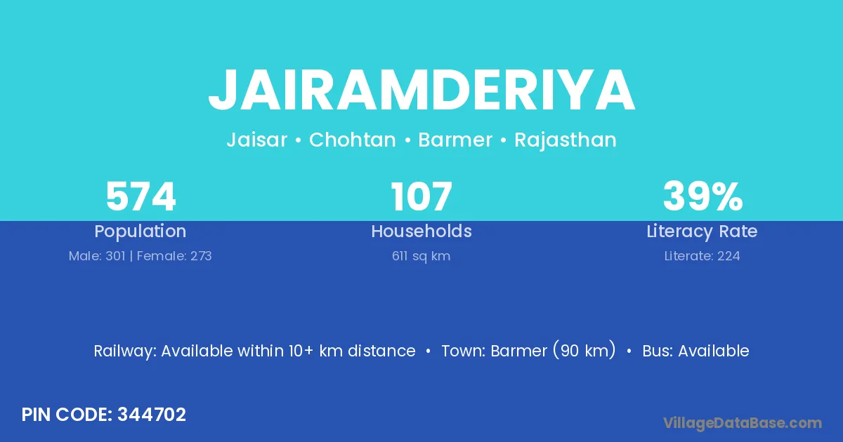 Barmer (90 km) is the nearest town to Jairamderiya village for major economic activities and is located approximately 90 km away.