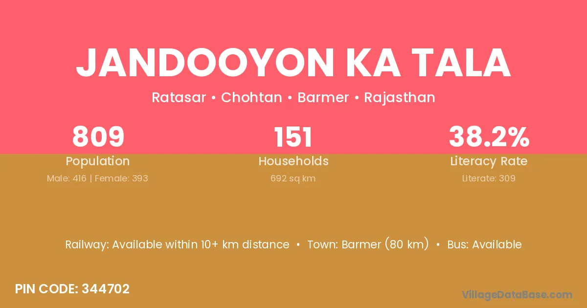 Barmer (80 km) is the nearest town to Jandooyon Ka Tala village for major economic activities and is located approximately 80 km away.