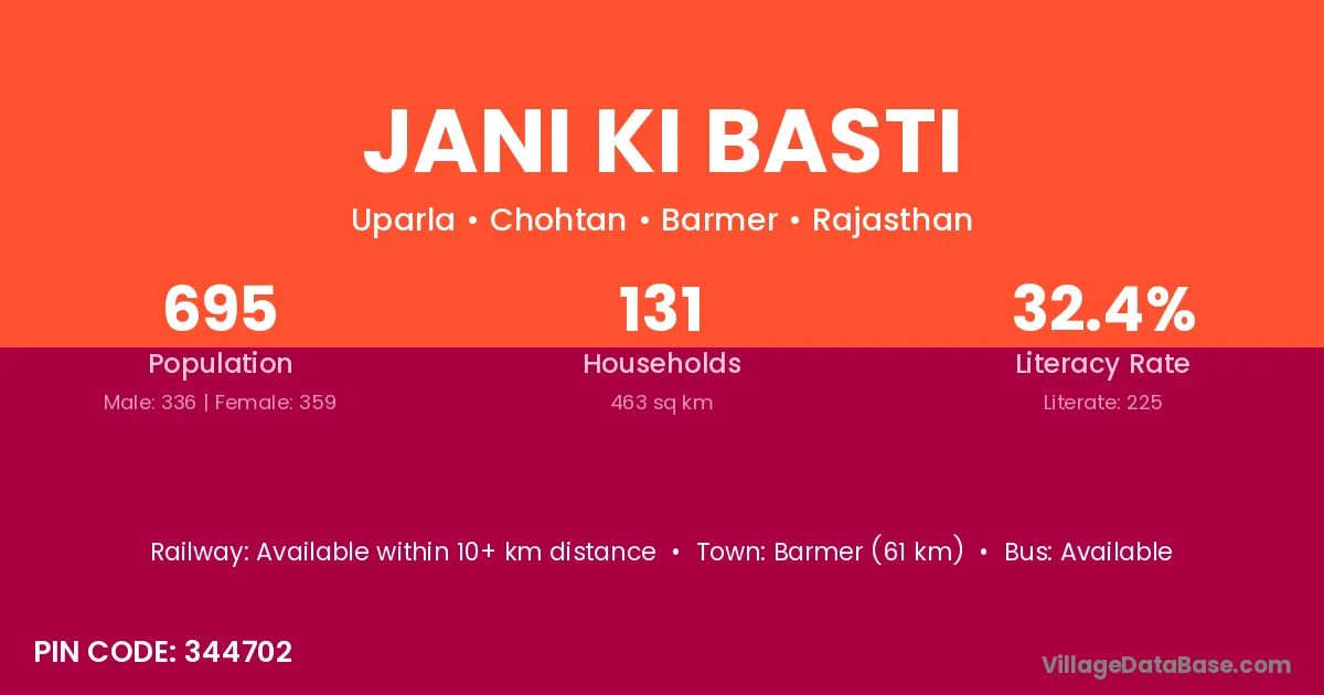 Barmer (61 km) is the nearest town to Jani Ki Basti village for major economic activities and is located approximately 61 km away.