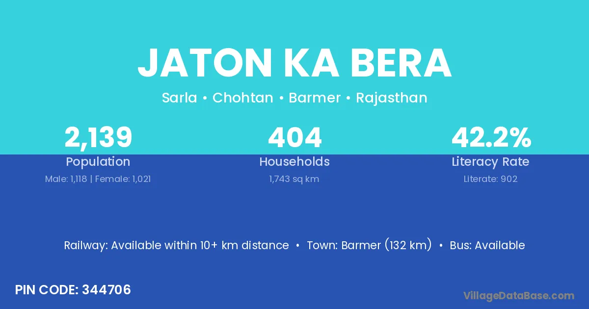 Jaton Ka Bera village has a total population of 2,139 people, of which 1,118 are males and 1,021 are females.
