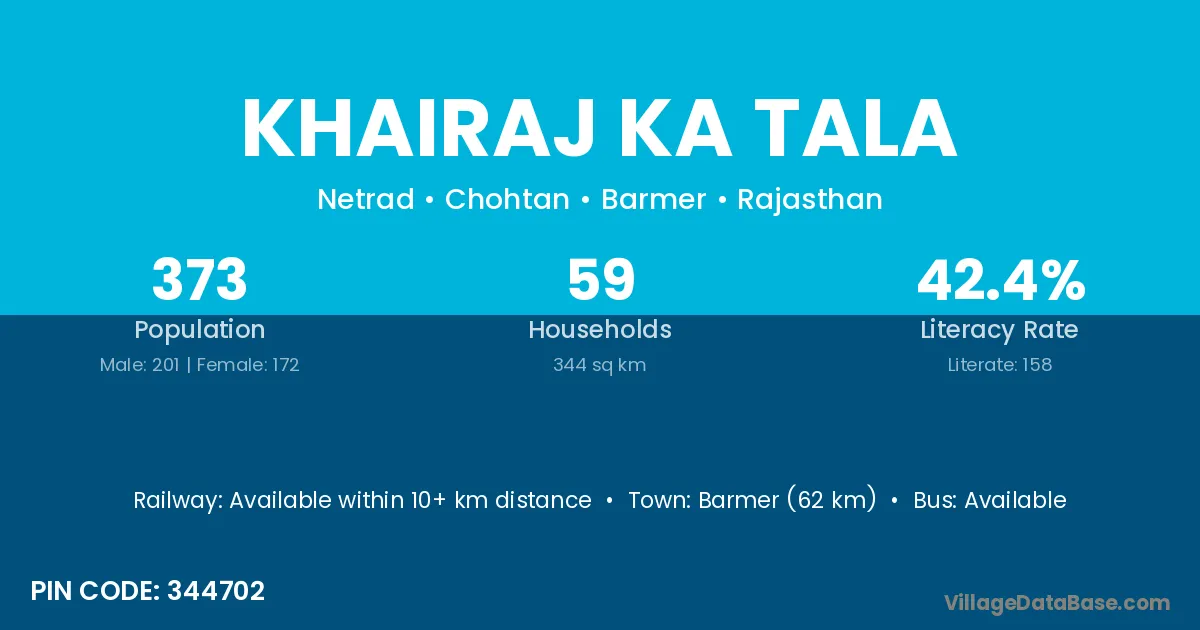Barmer (62 km) is the nearest town to Khairaj Ka Tala village for major economic activities and is located approximately 62 km away.