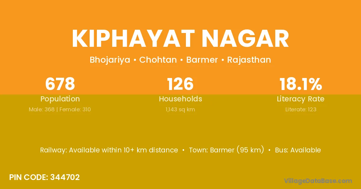 Barmer (95 km) is the nearest town to Kiphayat Nagar village for major economic activities and is located approximately 95 km away.