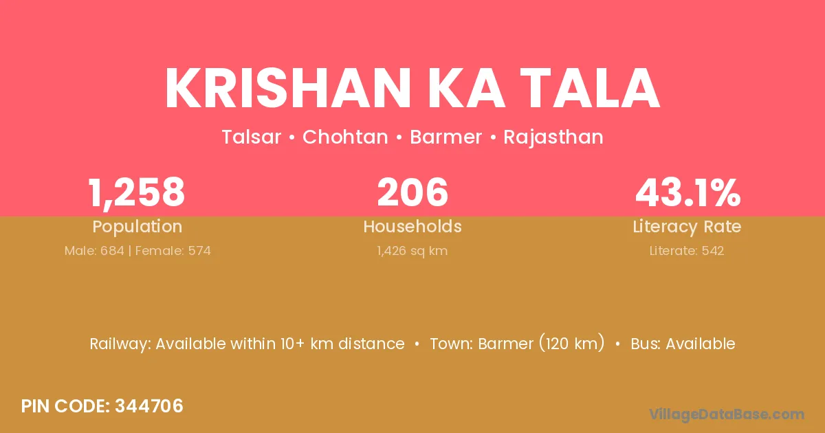 Krishan Ka Tala village has a total population of 1,258 people, of which 684 are males and 574 are females.