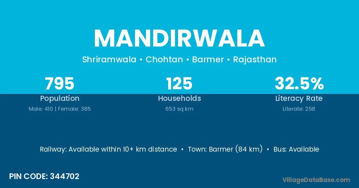 Barmer (84 km) is the nearest town to Mandirwala village for major economic activities and is located approximately 84 km away.