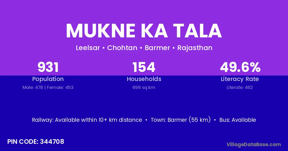 Barmer (55 km) is the nearest town to Mukne Ka Tala village for major economic activities and is located approximately 55 km away.