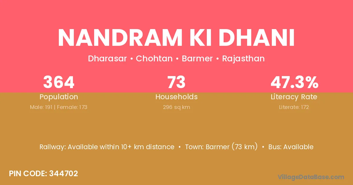 Nandram Ki Dhani village has a total population of 364 people, of which 191 are males and 173 are females.