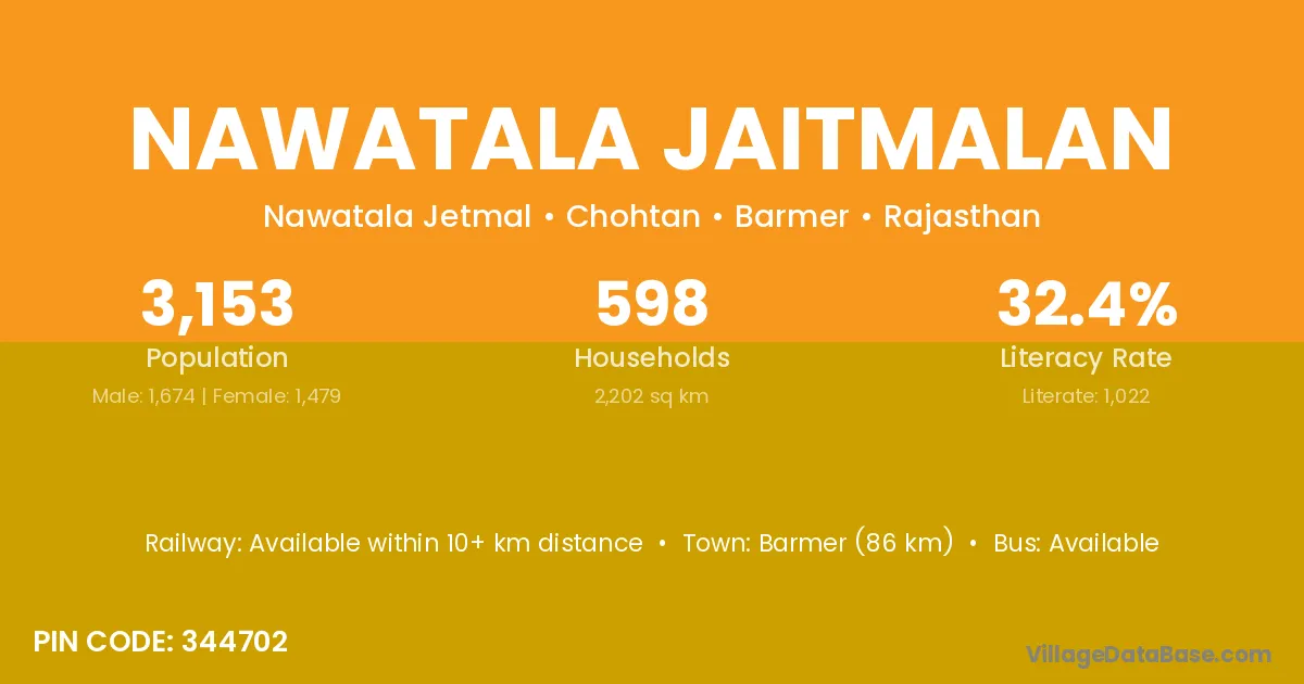 Barmer (86 km) is the nearest town to Nawatala Jaitmalan village for major economic activities and is located approximately 86 km away.