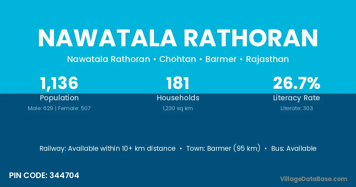 Barmer (95 km) is the nearest town to Nawatala Rathoran village for major economic activities and is located approximately 95 km away.
