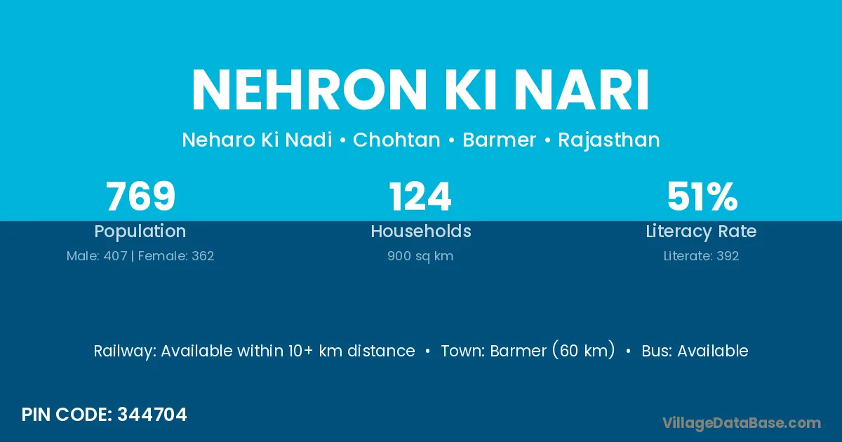 Barmer (60 km) is the nearest town to Nehron Ki Nari village for major economic activities and is located approximately 60 km away.