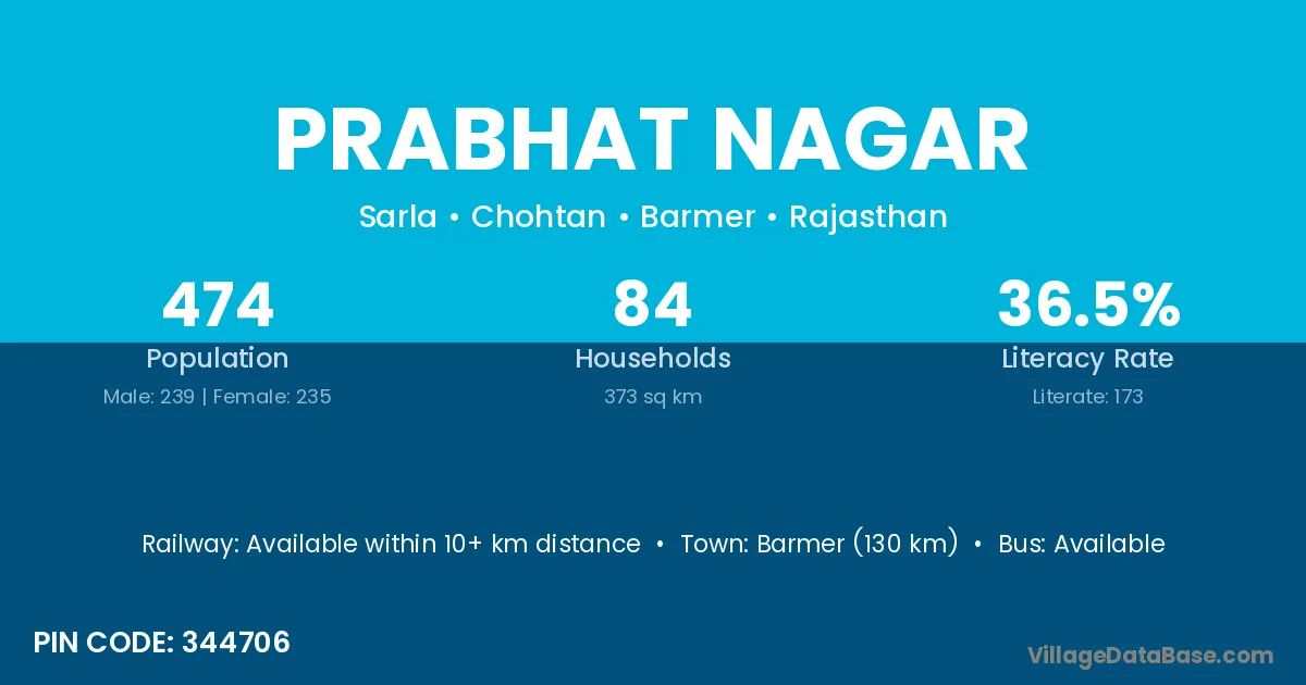 Barmer (130 km) is the nearest town to Prabhat Nagar village for major economic activities and is located approximately 130 km away.