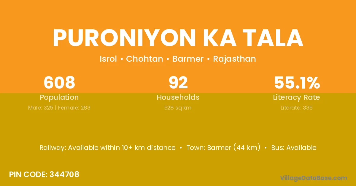 Barmer (44 km) is the nearest town to Puroniyon Ka Tala village for major economic activities and is located approximately 44 km away.