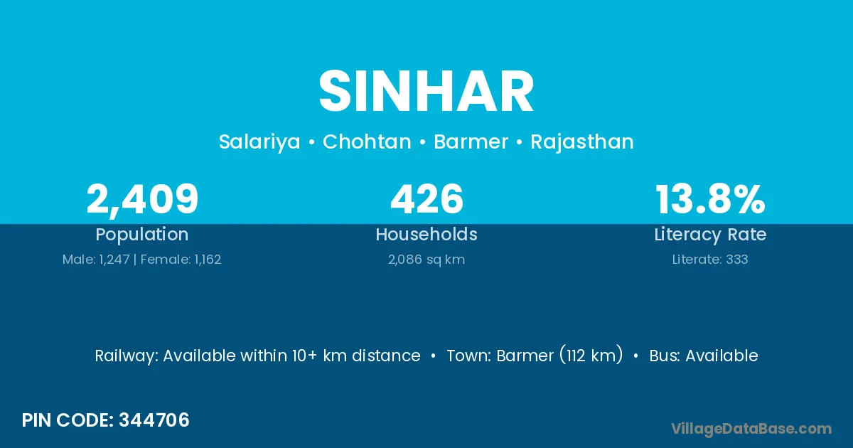 Barmer (112 km) is the nearest town to Sinhar village for major economic activities and is located approximately 112 km away.