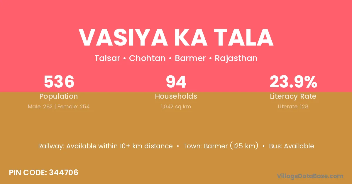 Vasiya Ka Tala village has a total population of 536 people, of which 282 are males and 254 are females.