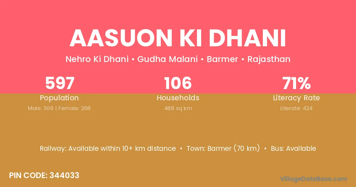 Barmer (70 km) is the nearest town to Aasuon Ki Dhani village for major economic activities and is located approximately 70 km away.