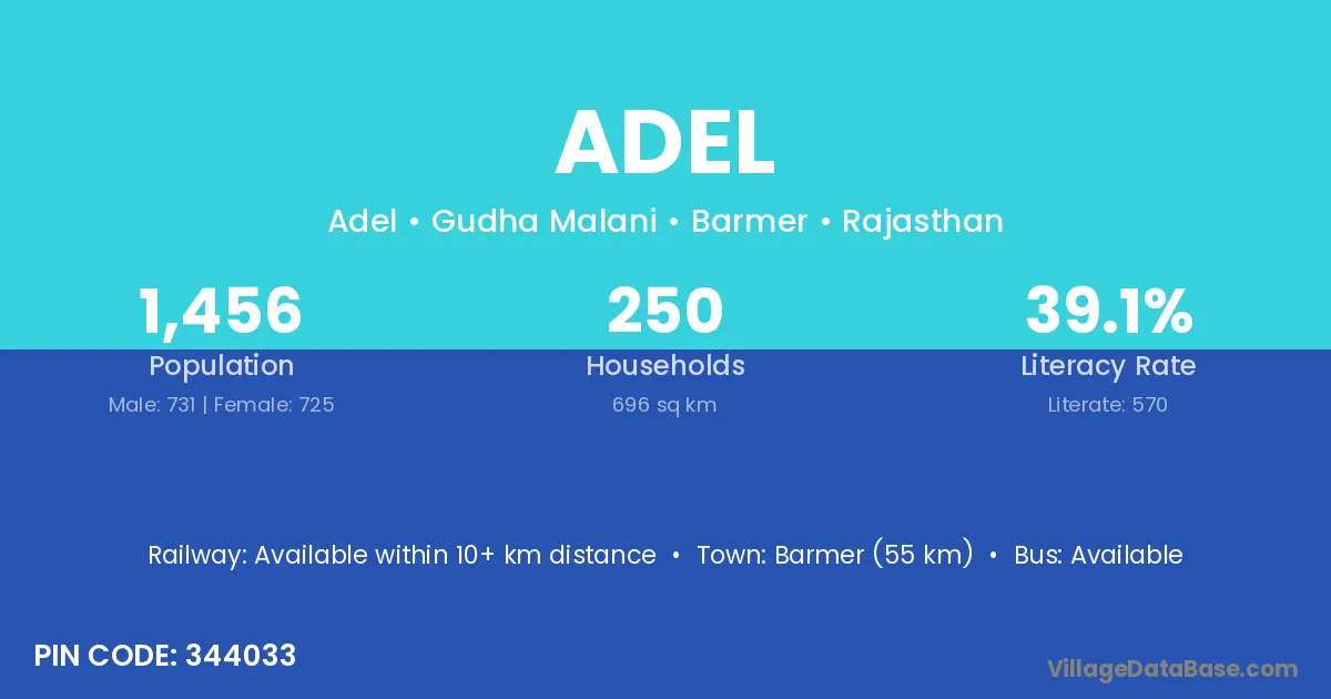 Barmer (55 km) is the nearest town to Adel village for major economic activities and is located approximately 55 km away.