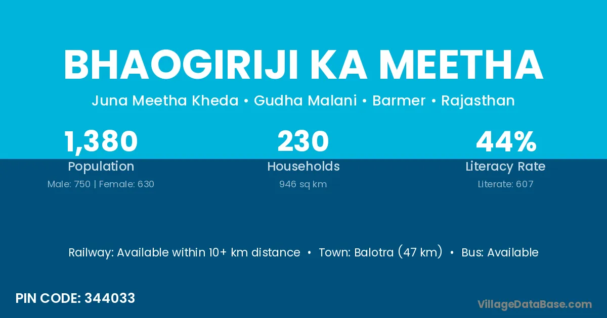 Bhaogiriji Ka Meetha village has a total population of 1,380 people, of which 750 are males and 630 are females.