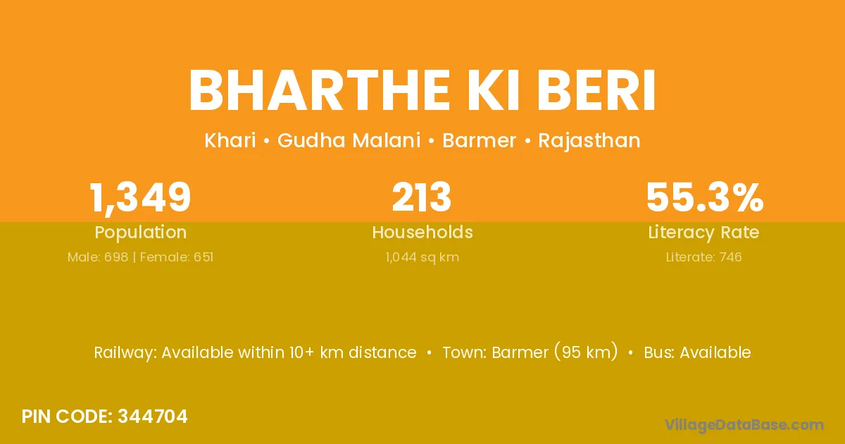 Barmer (95 km) is the nearest town to Bharthe Ki Beri village for major economic activities and is located approximately 95 km away.
