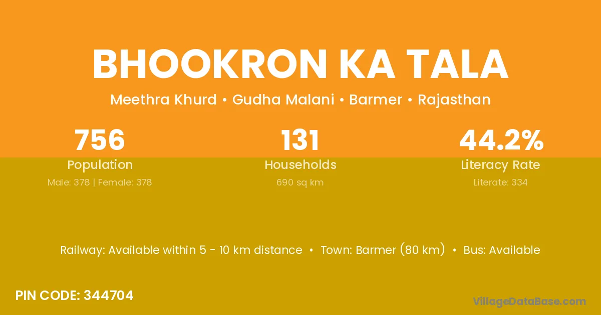 Bhookron Ka Tala village has a total population of 756 people, of which 378 are males and 378 are females.