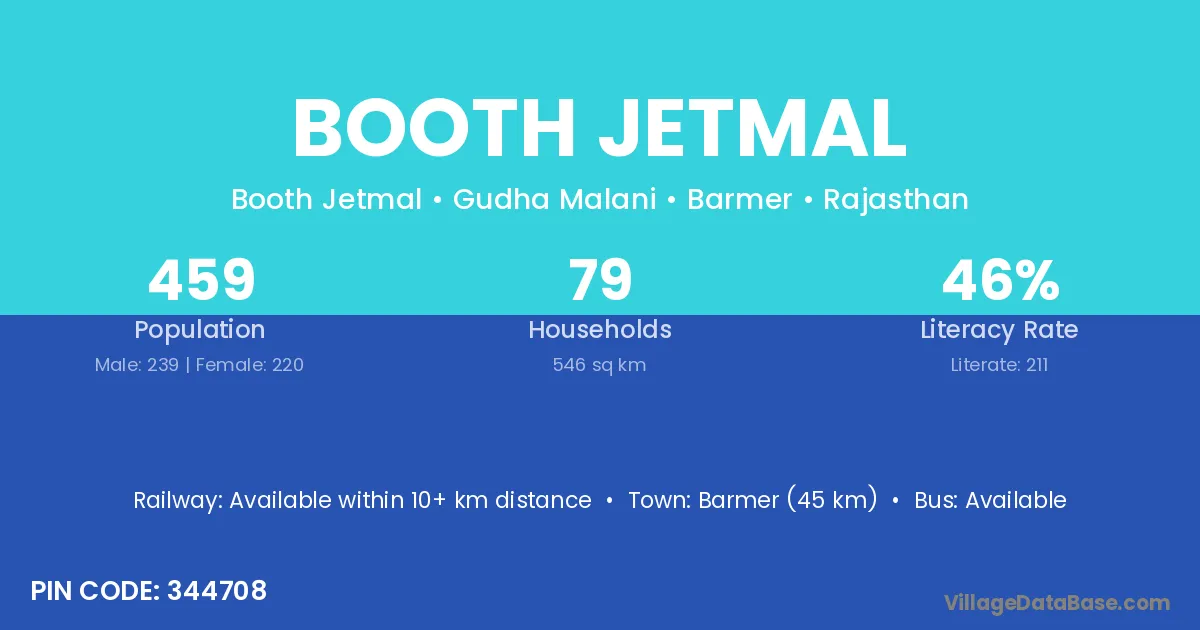Barmer (45 km) is the nearest town to Booth Jetmal village for major economic activities and is located approximately 45 km away.