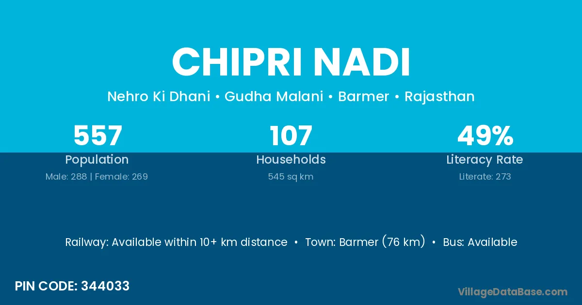 Barmer (76 km) is the nearest town to Chipri Nadi village for major economic activities and is located approximately 76 km away.
