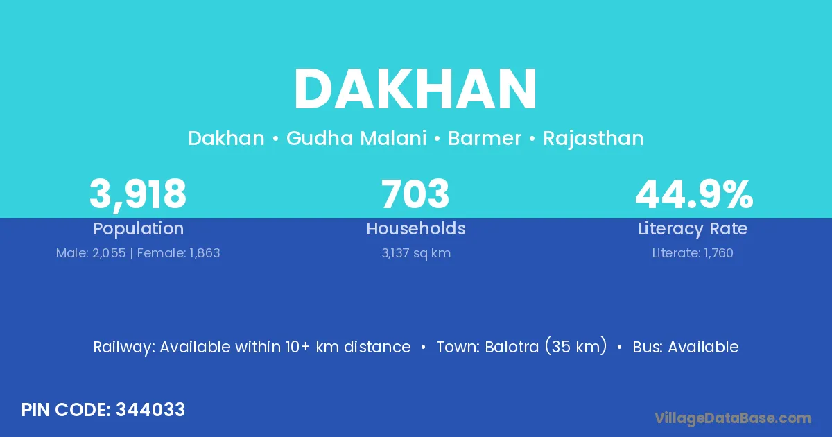 Balotra (35 km) is the nearest town to Dakhan village for major economic activities and is located approximately 35 km away.