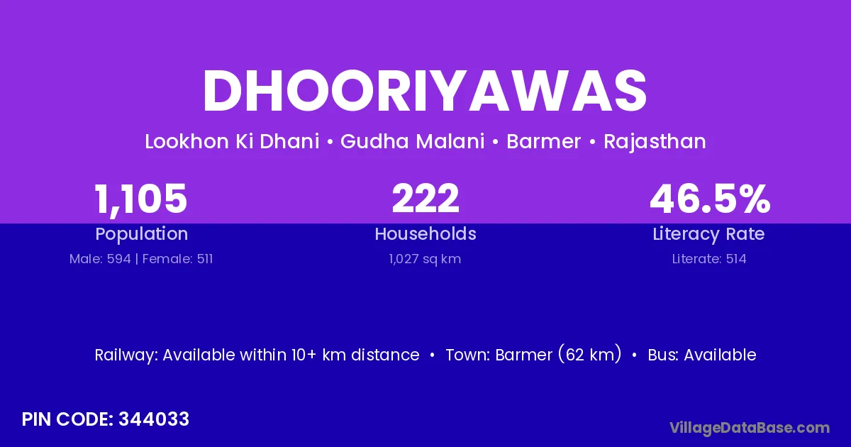 Barmer (62 km) is the nearest town to Dhooriyawas village for major economic activities and is located approximately 62 km away.