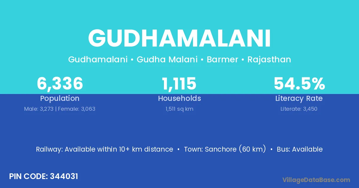 Sanchore (60 km) is the nearest town to Gudhamalani village for major economic activities and is located approximately 60 km away.