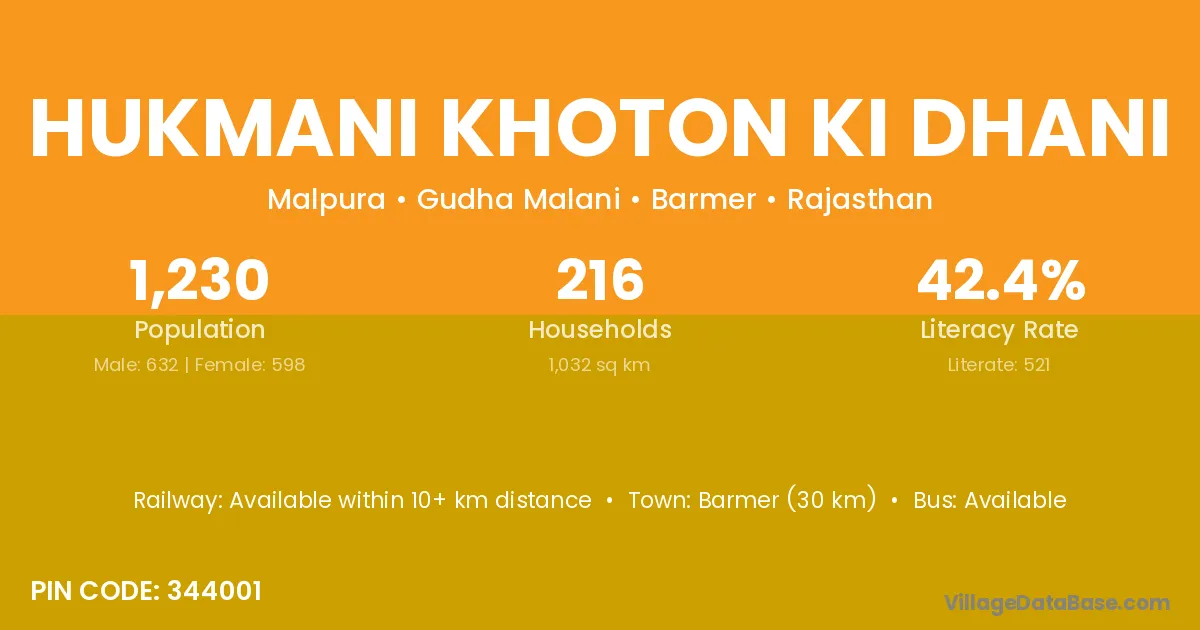 Hukmani Khoton Ki Dhani village has a total population of 1,230 people, of which 632 are males and 598 are females.