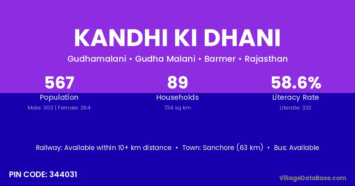 Sanchore (63 km) is the nearest town to Kandhi Ki Dhani village for major economic activities and is located approximately 63 km away.
