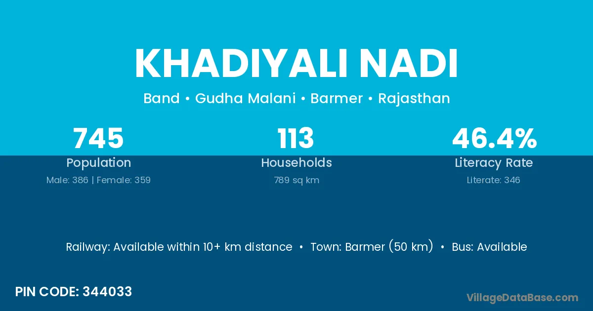 Barmer (50 km) is the nearest town to Khadiyali Nadi village for major economic activities and is located approximately 50 km away.