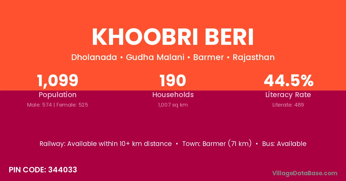 Barmer (71 km) is the nearest town to Khoobri Beri village for major economic activities and is located approximately 71 km away.
