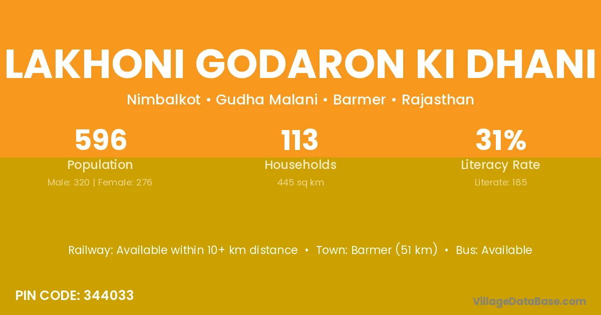 Barmer (51 km) is the nearest town to Lakhoni Godaron Ki Dhani village for major economic activities and is located approximately 51 km away.
